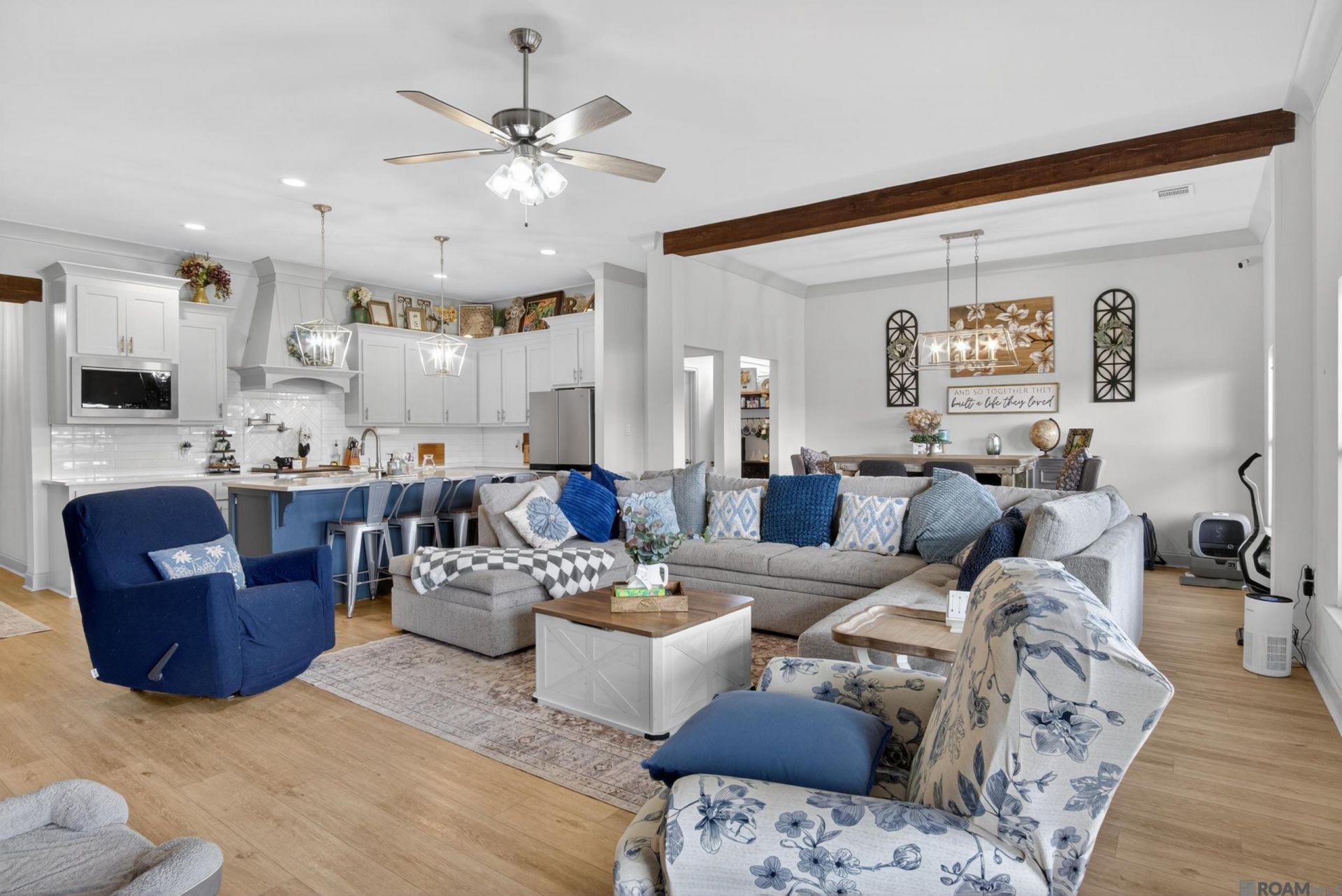 Welcome to this beautiful custom-built 4-bedroom, 3-bath home offering 2,298 sq ft of thoughtfully designed living space on over an acre of waterfront property. Nestled on a lake lot in Flood Zone X (no flood insurance required), this home features impeccable curb appeal with, low-maintenance landscaping, an inviting extended front porch, and a spacious rear porch perfect for relaxing or entertaining while enjoying lake views. Inside, the open and split floor plan blends style and function. The main living areas feature luxury vinyl plank flooring and include a family room with a wall of windows, gas log fireplace with brick surround, and a cypress beam accent separating the dining space. The chef's kitchen boasts a large granite island with seating, 3cm granite countertops, custom cabinetry with a built-in trash drawer, decorative subway tile backsplash, stainless steel appliances, 5-burner gas range with oven, pot filler, and custom hood. The private primary suite offers luxury vinyl flooring, an en suite bath with dual granite vanities, a soaking tub with tile surround, separate fiberglass shower, and a walk-in closet with direct access to the laundry room. Three additional bedrooms are located on the opposite side of the home, with two sharing a Jack & Jill bath. Additional features include a mudroom off the garage, High efficiency AC system, Camera system, Christmas light package with holiday-ready exterior electrical outlets, Hot water hose connection outside, Outdoor kitchen hook ups, and a whole-house generator for peace of mind during outages. This home has it all?schedule your private showing today! Photos are edited by a professional photo editor for marketing purposes. Some photos may have Ai Generated Furniture in the homes for visualization purposes.