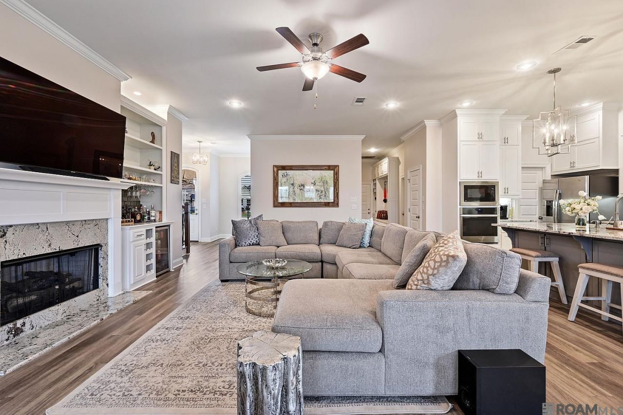Five bedroom home in the Belle Savanne subdivision of Dutchtown. Step into the grand foyer to views of the great room and the large extended covered patio and backyard. Gourmet kitchen features stainless appliances including gas cooktop, single wall oven, built in microwave, painted custom cabinets with extended uppers, under cabinet lighting and 5 hardware, 3cm granite, herringbone marble backsplash, pot filler, large island bar with custom pendant lights, and walk-in pantry. Living room features ventless gas fireplace with granite surround, custom built in bar with beverage fridge. Master bedroom includes a spa-like bath, featuring a separate 5' soaking tub and custom tiled shower with a seamless shower door, dual sinks, framed mirrors, separate water closet, and huge walk around closet with custom wood shelving. Downstairs you will also find a study/bedroom and a full bath for guests. Beautiful, stained wood staircase will lead you upstairs where you will find a large loft, 3 nice-sized bedrooms with walk